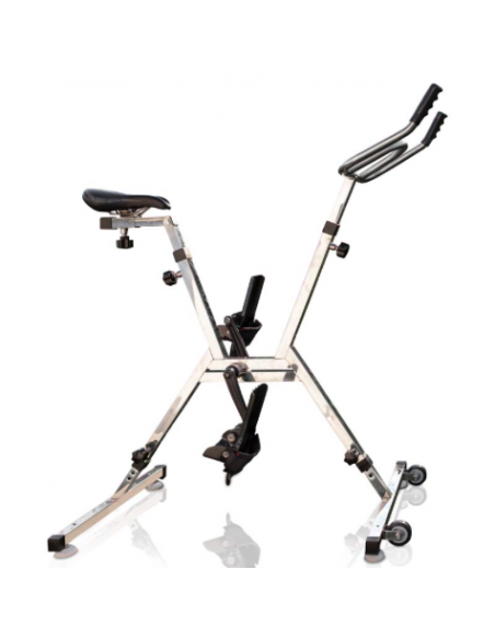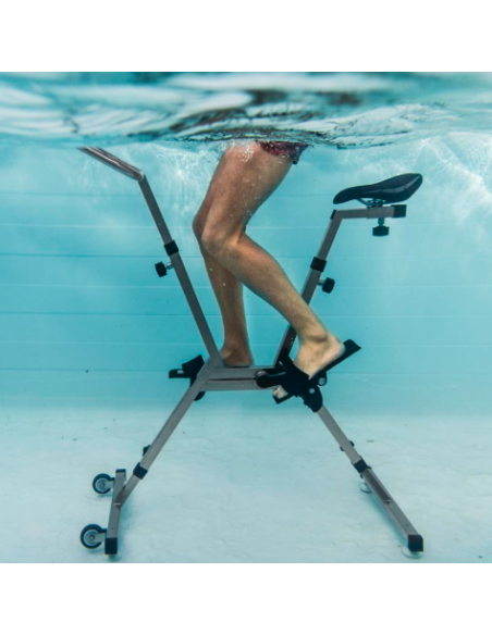 La Aquabike es una bicicleta estática diseñada para uso acuático, ideal para entrenamientos en el agua. Fabricada en acero inoxidable AISI-316, asegura una resistencia y durabilidad superiores. Es adecuada para piscinas con cloración salina y puede utilizarse en piscinas con profundidades de entre 1 y 1,5 metros.